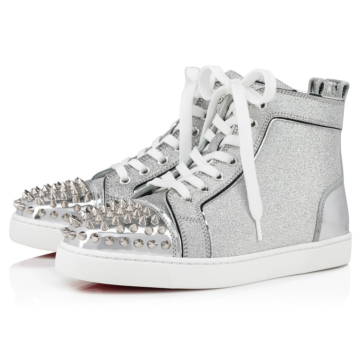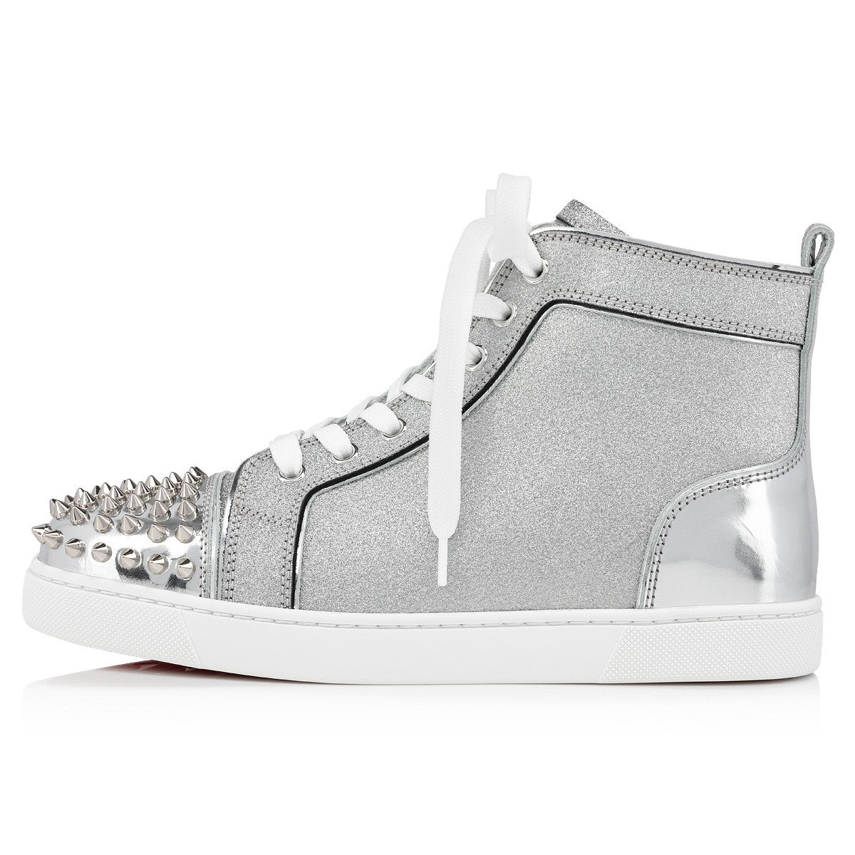【Christian Louboutin】クリスチャン ルブタン Lou Spikes Woman Specchio Leather and Glittered Calf Leather Silver High-top Sneakers