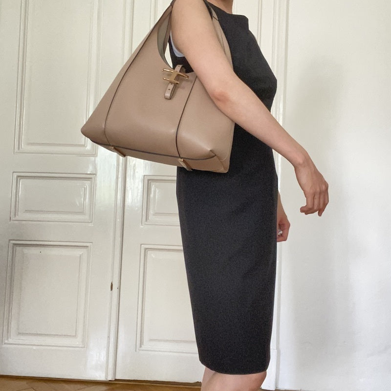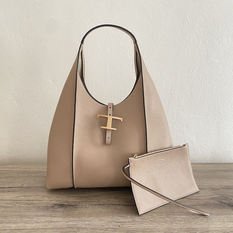 バーティカル リブ、ロゴ入りの T タイムレス メタル ペンダントが特徴の、きめ細やかなグレイン レザーのホーボー バッグ。内部の広いコンパートメントに取り出し可能なポーチを備え、日々の装いにトッズらしい品格を添えるスタイルです。
