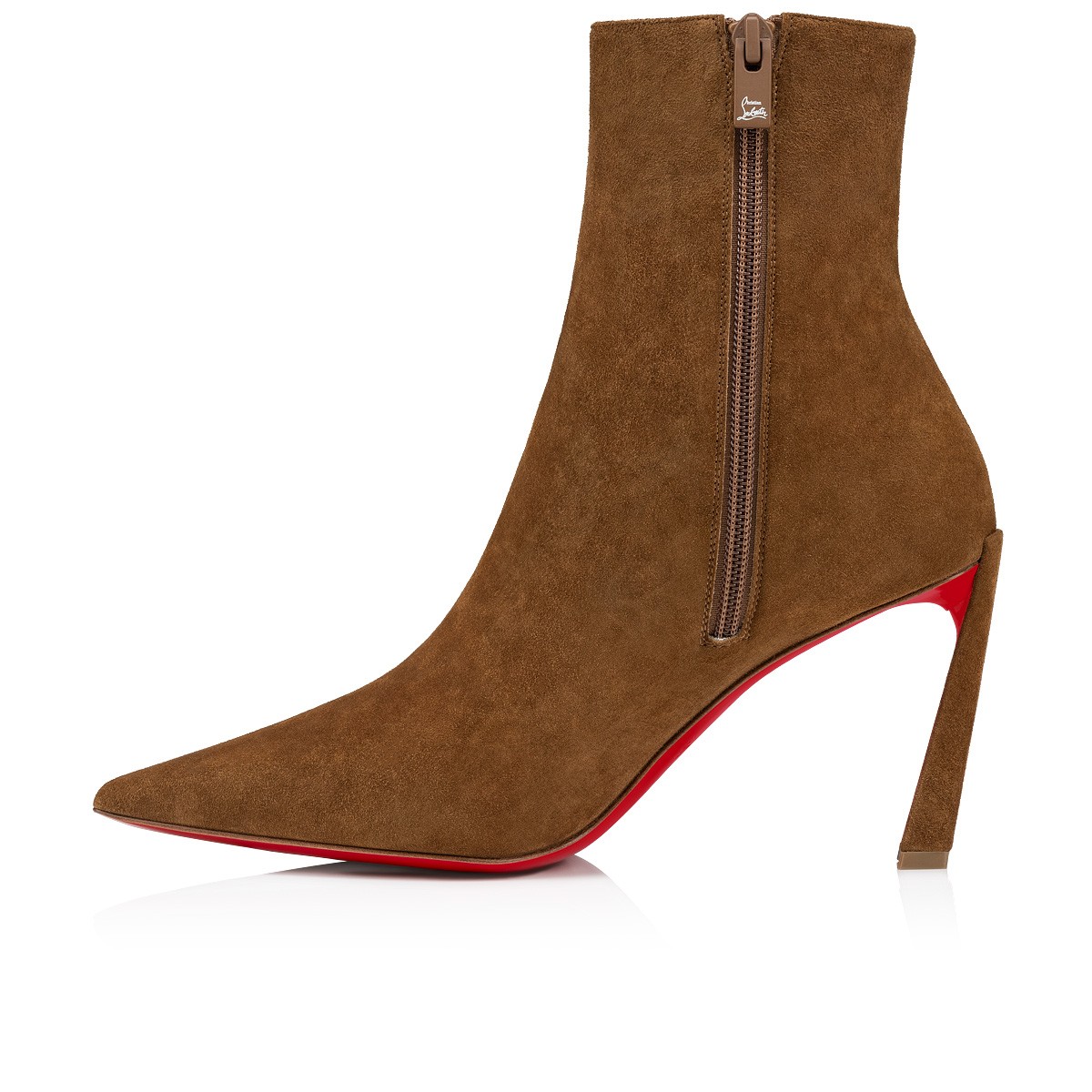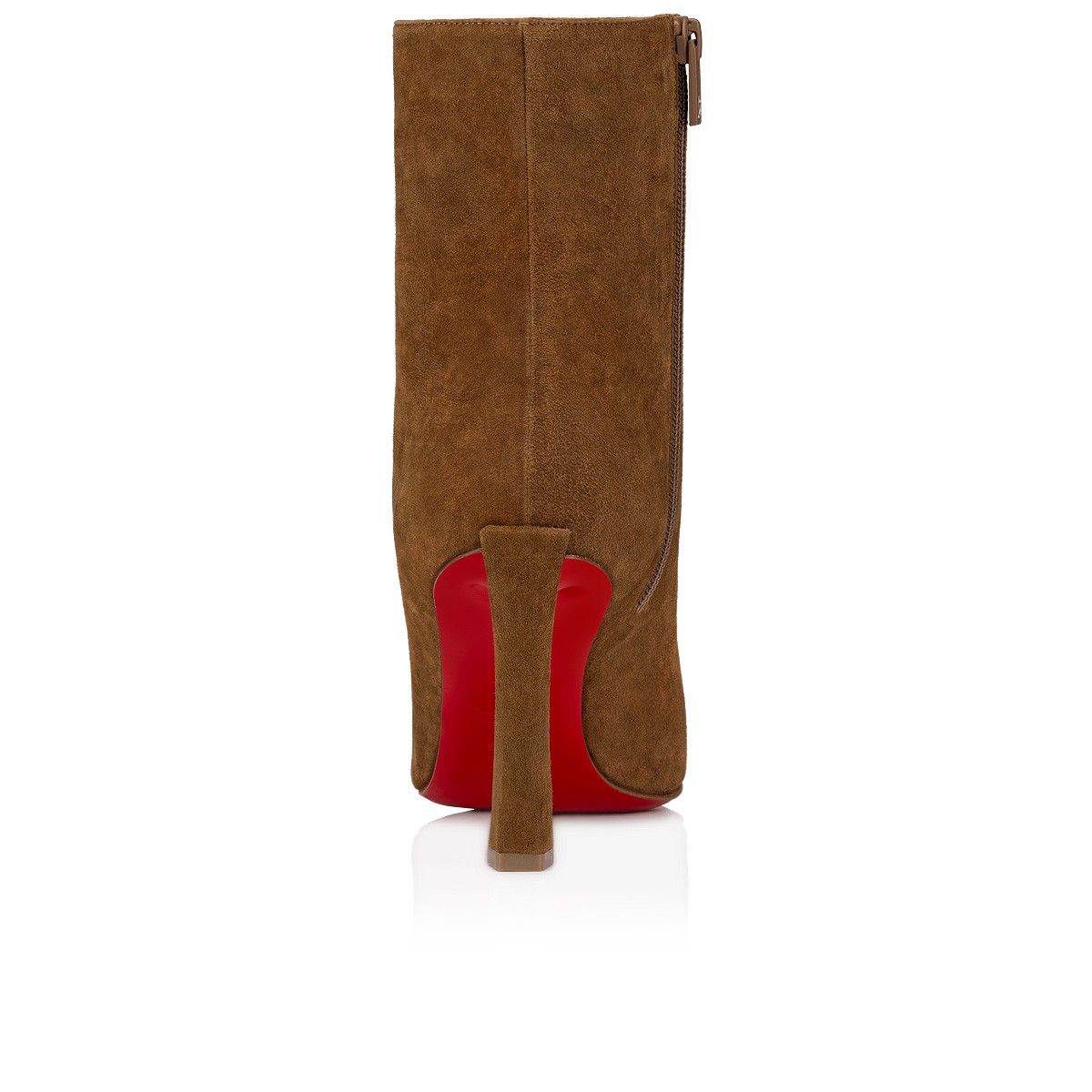A thoroughly modern piece, the Condora Booty features Maison Christian Louboutin's architectural Plume heel, which reveals a flash of Loubi red. Set on a 85 mm heel, the sumptuous veau velours suede upper, in soft Rhea brown, features a straight cut across the ankle. This booty features a timeless stiletto boot design, with a zip closure on the inside and pointed toe.
